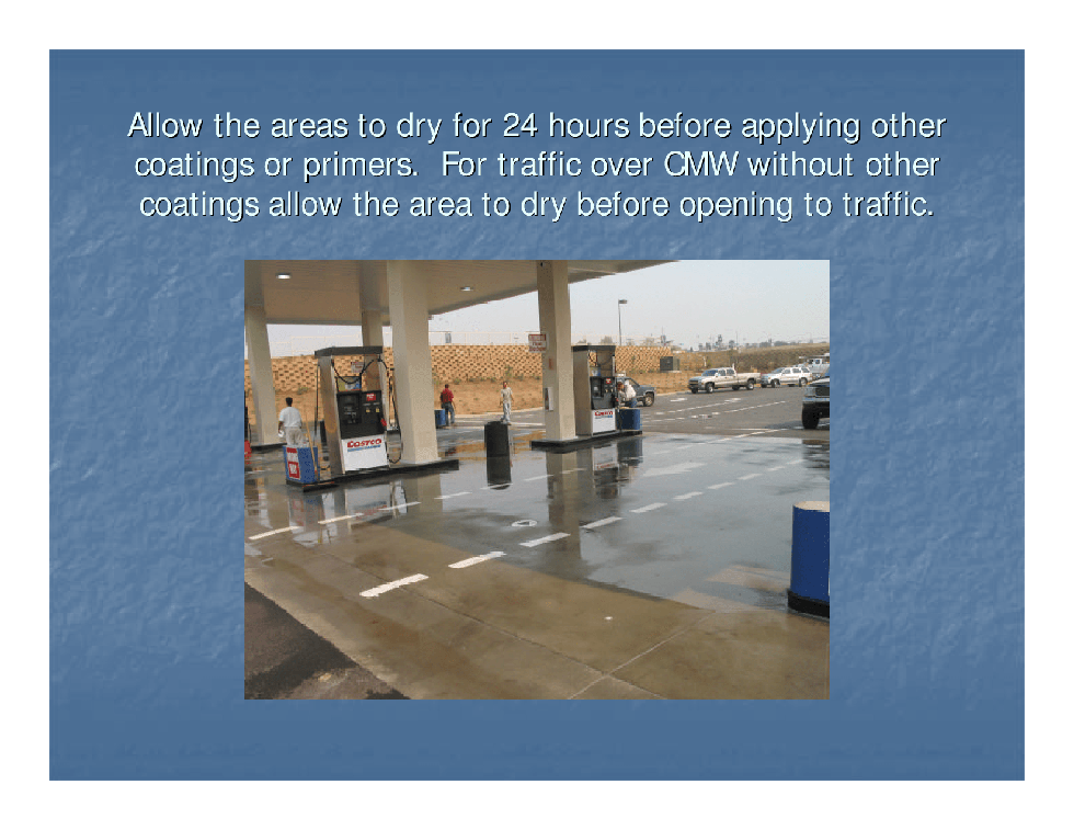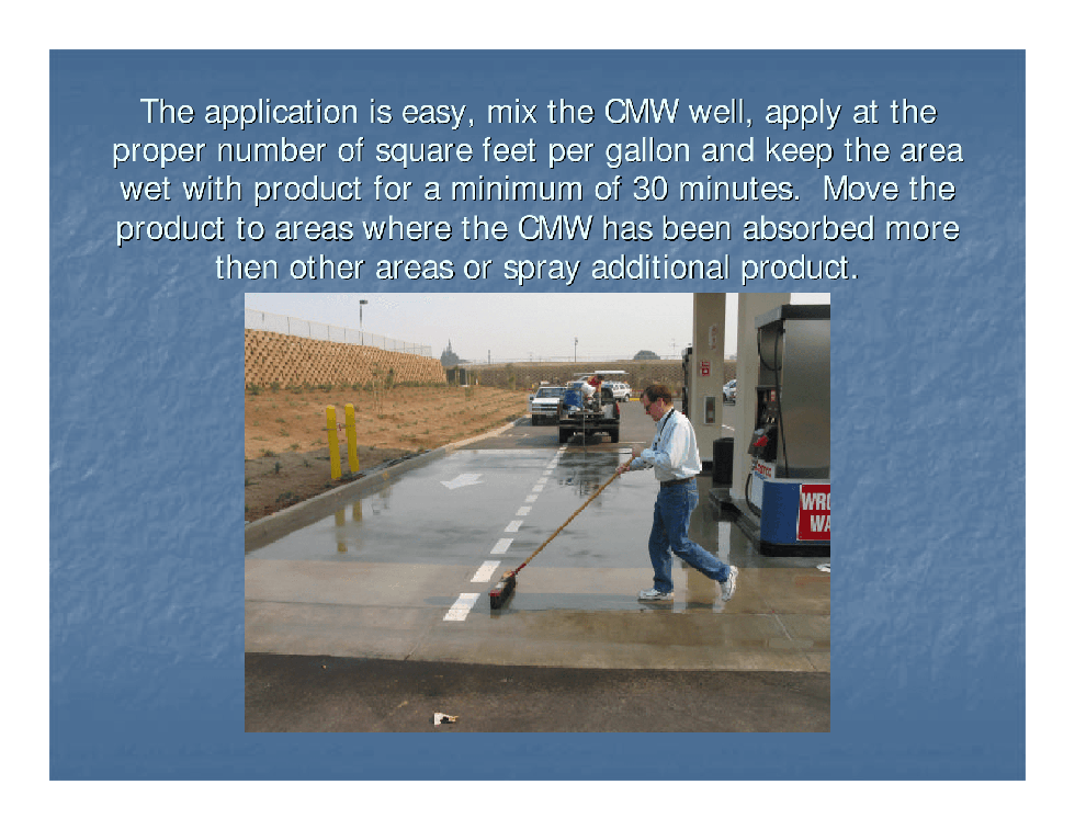 Application: Application range - 35°F to 125°F. Make the application of the product as soon as the preparation cleaning is complete. The concrete surface may be slightly damp for the CMW application.